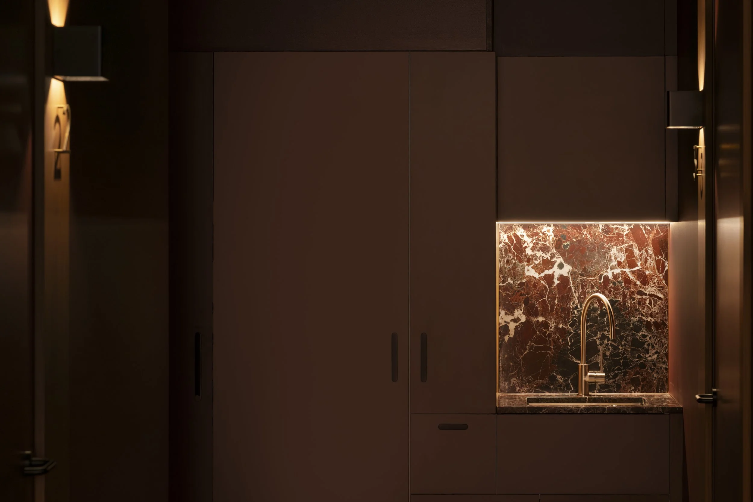 Layered lighting—combining wall sconces, pendants, and concealed illumination—creates intimacy and warmth, guiding movement through the space and reinforcing a sense of quiet clarity from arrival to treatment rooms.